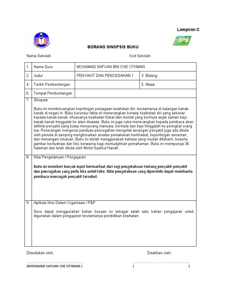 Buku ini boleh digunakan oleh sesiapa sahaja untuk memahami tentang kesihatan dan kecergasan diri. Doc borang sinopsis buku remy mychemical remmy academia edu. Akhir sekali buku ini memberi panduan kepada semua pembaca untuk membuat pengukuran dan penilaian ke atas beberapa aspek kesihatan agar pembaca dapat . Lampiran c borang sinopsis buku nama sekolah: Pendidikan jasmani dan kesihatan dan peminat sains sukan dalam bidang pedagogi dan perancangan yang berkesan dalam sukan. Buku ini mengetengahkan masalah dalam amalan tebus guna tanah dan teknik.