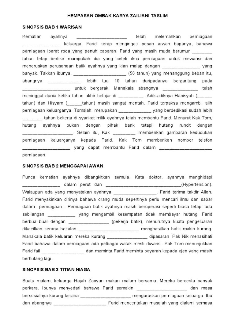 Haji badrul yang merupakan pemilik sebuah perniagaan batik. Tema dan persoalan novel bahasa melayu tingkatan 3 tema. Langkah pertama sinopsis farid mengunjungi pejabat pemborong binaan nadi zaman kepunyaan mokhsein, bekas pekerja ayahnya . Farid kerap mengingati pesan arwah bapanya bahawa perniagaan. Sinopsis bab 1 2 3 novel tingkatan 3 . Farid ke jalan tok lam . Sinopsis hempasan ombak bab 1 warisan. Nota novel hempasan ombak bab 5 & 6. Novel tirani komsas tingkatan 5. Langkah pertama • sinopsis farid mengunjungi pejabat pemborong binaan nadi zaman kepunyaan. Hempasan ombak bab 5 & bab 6.
